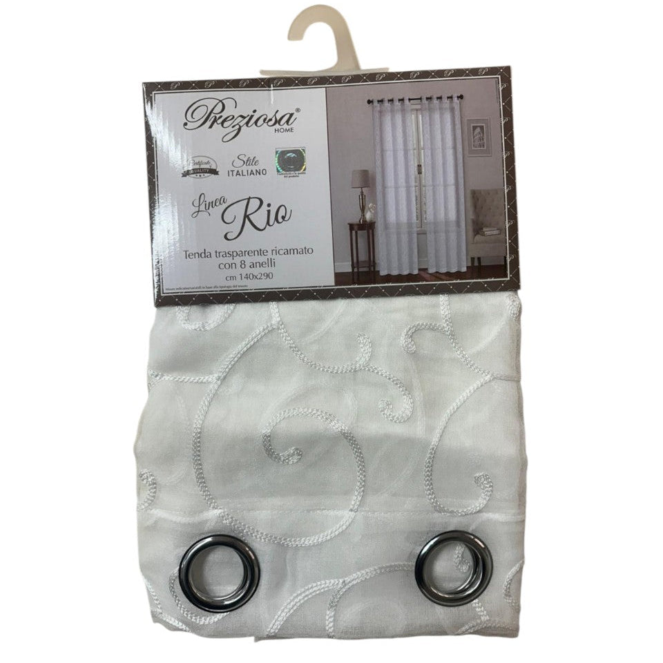 COPPIA TENDE PREZIOSA HOME Linea RIO D19 trasparente 2 PANNELLI CON ANELLI 140cmx290cm Dimensioni 140x290 cm Con ricamo lurex Composizione 100% Poliestere La tenda è pronta per esser...